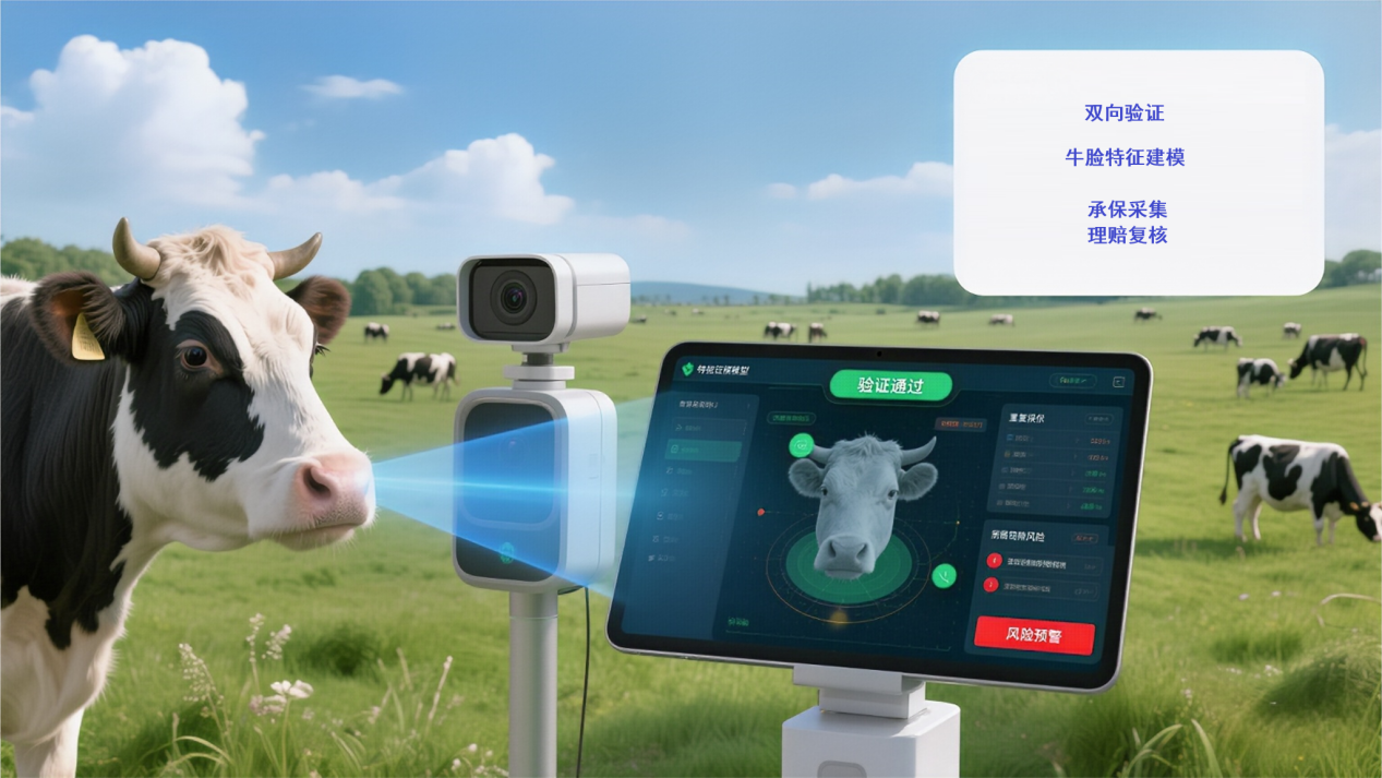 核心技术架构:构建"目标检测-图像质检-畜脸识别"三位一体AI架构,建立从数据采集到身份核验的全流程智能验标体系。通过多模态生物特征采集设备同步获取牲畜面部特征与鼻纹数据,经深度学习算法完成图像质量评估与特征向量提取,构建生物特征库。 系统集成应用:创新融合投保基础数据库与理赔影像数据池,开发多源数据交叉验证模型,实现牲畜身份的可追溯性确权。该技术方案将生物特征与业务数据深度绑定,形成"数据采集-特征建模-身份核验"的完整闭环。